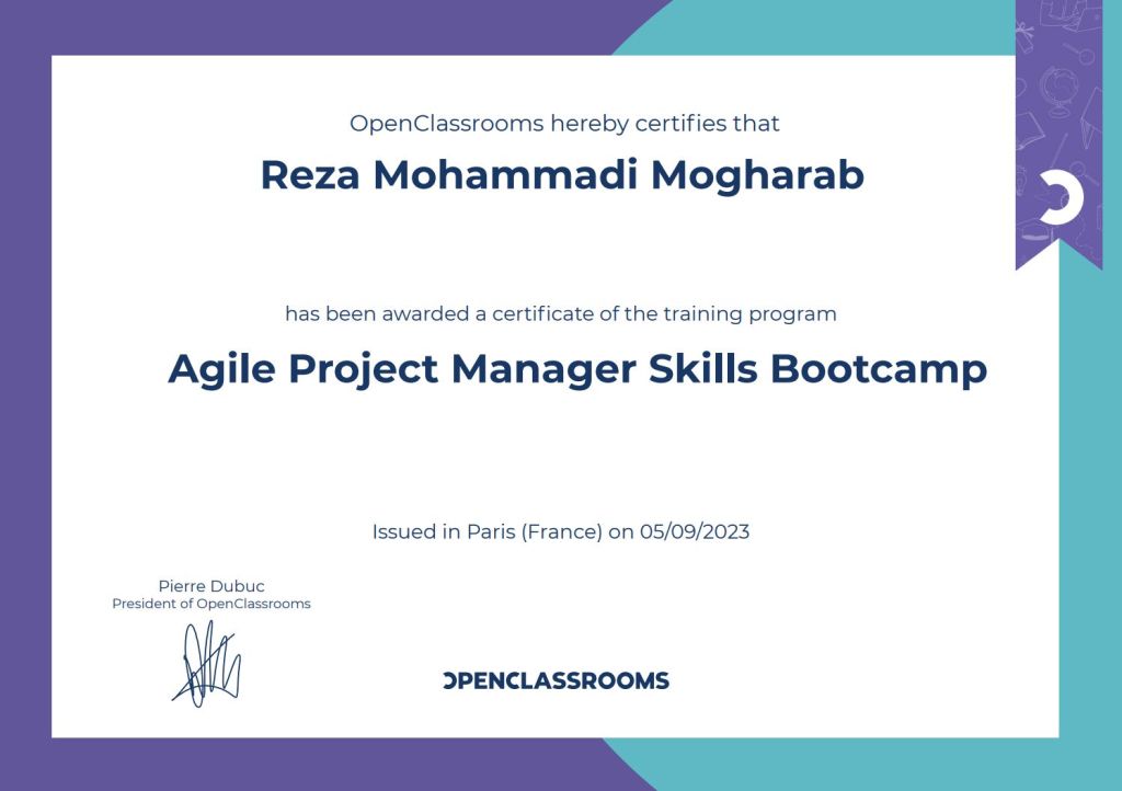 This certificate represents my successful completion of the Agile Project Management BootCamp by OpenClassrooms. The program provided an in-depth exploration of agile principles, covering essential topics such as stakeholder engagement, product roadmap development, feature list creation, and crafting detailed acceptance criteria. It also focused on product backlog prioritization, adaptive planning, and value-driven delivery, equipping me with practical techniques for agile team collaboration and transforming traditional project management practices into efficient, agile workflows.